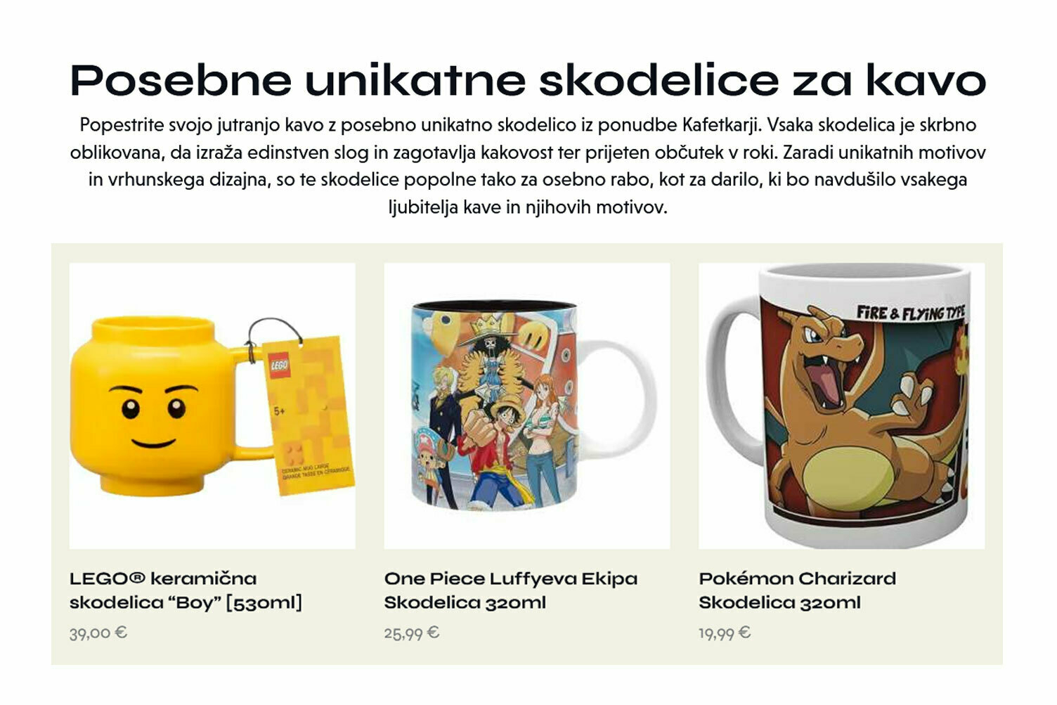 **Ročna izdelava in kakovostni materiali ** Veliko skodelic, ki jih ponujajo na Kafetkarji.si, je ročno izdelanih, kar pomeni, da je vsaka skodelica edinstvena. Uporabljajo odlične materiale, kot so keramika, porcelan ali steklo, kar poskrbi za dolgoživost in prijeten občutek pri pitju kave.